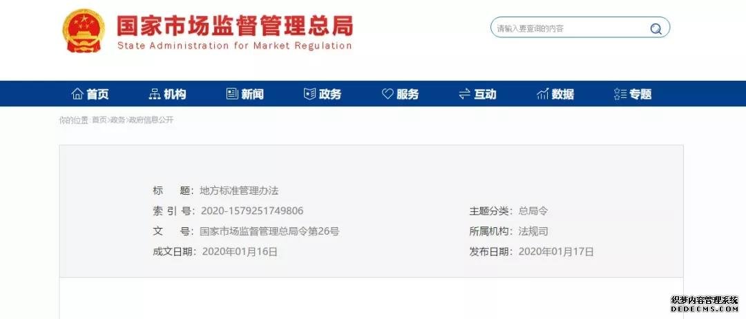 《地方標準管理辦法》已于2019年12月23日經國家市場監督管理總局2019年第18次局務會議審議通過,現予公布,自2020年3月1日起施行。 (2020年1月16日國家市場監督管理總局令第26號公布)第一條 為了加強地方標準管理,根據《中華人民共和國標準化法》,制定本辦法。第二條 地方標準的制定、組織實施及其監督管理,適用本辦法。法律、行政法規和國務院決定另有規定的,依照其規定。第三條 為滿足地方自然條件、風俗習慣等特殊技術要求,省級標準化行政主管部門和經其批準的設區的市級標準化行政主管部門可以在農業、工業、服務業以及社會事業等領域制定地方標準。第四條 制定地方標準應當遵循開放、透明、公平的原則,有利于科學合理利用資源,推廣科學技術成果,做到技術上先進、經濟上合理。第五條 地方標準的技術要求不得低于強制性國家標準的相關技術要求,并做到與有關標準之間的協調配套。禁止通過制定產品質量及其檢驗方法地方標準等方式,利用地方標準實施妨礙商品、服務自由流通等排除、限制市場競爭的行為。第六條 國務院標準化行政主管部門統一指導、協調、監督全國地方標準的制定及相關管理工作。縣級以上地方標準化行政主管部門依據法定職責承擔地方標準管理工作。第七條 省級標準化行政主管部門應當組織標準化技術委員會,承擔地方標準的起草、技術審查工作。設區的市級標準化行政主管部門應當發揮標準化技術委員會作用,承擔地方標準的起草、技術審查工作。未組織標準化技術委員會的,應當成立專家組,承擔地方標準的起草、技術審查工作。標準化技術委員會和專家組應當具有專業性、獨立性和廣泛代表性。承擔起草工作的人員不得承擔技術審查工作。第八條 社會團體、企業事業組織以及公民可以向設區的市級以上地方標準化行政主管部門或者有關行政主管部門提出地方標準立項建議。設區的市級以上地方標準化行政主管部門應當將收到的立項建議通報同級有關行政主管部門。第九條 設區的市級以上地方有關行政主管部門可以根據收到的立項建議和本行政區域的特殊需要,向同級標準化行政主管部門提出地方標準立項申請。第十條 設區的市級以上地方標準化行政主管部門應當對有關行政主管部門、企業事業組織、社會團體、消費者和教育、科研機構等方面的實際需求進行調查,對制定地方標準的必要性、可行性進行論證評估,并對立項申請是否符合地方標準的制定事項范圍進行審查。第十一條 設區的市級以上地方標準化行政主管部門應當根據論證評估、調查結果以及審查意見,制定地方標準立項計劃。地方標準立項計劃應當明確項目名稱、提出立項申請的行政主管部門、起草單位、完成時限等。第十二條 起草單位應當對地方標準相關事項進行調查分析、實驗、論證。有關技術要求需要進行試驗驗證的,應當委托具有相應能力的技術單位開展。第十三條 起草單位應當征求有關行政主管部門以及企業事業組織、社會團體、消費者組織和教育、科研機構等方面意見,并在設區的市級以上地方標準化行政主管部門門戶網站向社會公開征求意見。公開征求意見的期限不少于三十日。第十四條 起草單位應當根據各方意見對地方標準進行修改完善后,與編制說明、有關行政主管部門意見、征求意見采納情況等材料一并報送標準化行政主管部門技術審查。第十五條 設區的市級以上地方標準化行政主管部門應當組織對地方標準的下列事項進行技術審查:(二)技術要求是否不低于強制性國家標準的相關技術要求,并與有關標準協調配套;第十六條 起草單位應當將根據技術審查意見修改完善的地方標準,與技術審查意見處理情況及本辦法第十四條規定的需要報送的其他材料一并報送立項的標準化行政主管部門審核。第十七條 設區的市級以上地方標準化行政主管部門應當組織對地方標準報批稿及相關材料進行審核,對報送材料齊全、制定程序規范的地方標準予以批準、編號。第十八條 地方標準的編號,由地方標準代號、順序號和年代號三部分組成。省級地方標準代號,由漢語拼音字母“DB”加上其行政區劃代碼前兩位數字組成。市級地方標準代號,由漢語拼音字母“DB”加上其行政區劃代碼前四位數字組成。第十九條 地方標準發布前,提出立項申請的行政主管部門認為相關技術要求存在重大問題或者出現重大政策性變化的,可以向標準化行政主管部門提出項目變更或者終止建議。標準化行政主管部門可以根據有關行政主管部門的建議等,作出項目變更或者終止決定。第二十條 地方標準由設區的市級以上地方標準化行政主管部門發布。第二十一條 設區的市級以上地方標準化行政主管部門應當自地方標準發布之日起二十日內在其門戶網站和標準信息公共服務平臺上公布其制定的地方標準的目錄及文本。第二十二條 地方標準應當自發布之日起六十日內由省級標準化行政主管部門向國務院標準化行政主管部門備案。備案材料應當包括發布公告及地方標準文本。國務院標準化行政主管部門應當將其備案的地方標準通報國務院有關行政主管部門。第二十三條 縣級以上地方標準化行政主管部門和有關行政主管部門應當依據法定職責,對地方標準的實施進行監督檢查。第二十四條 設區的市級