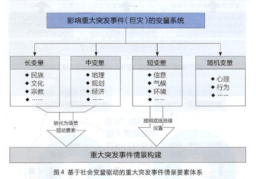 重大突發事件本身是一個復雜系統。當嘗試通過“情景構建”來表征重大突發事件的規律特點時,按照社會物理學理論,需要對一系列社會變量進行描述,決定重大突發事件情景的變量包含:長變量(與民族、文化、宗教相關的變量)、中變量(與地理、規劃、經濟、社會相關的變量)、短變量(與信息、氣候、環境、交通等相關的變量)、隨機變量(與心理、行為以及未知因素相關的變量)(見圖4)。為確保重大突發事件情景能夠準確地代表不斷演化的國家風險(或者地區風險),情景構建過程中,需將上面所述的長變量與中變量設置為情景恒定要素,當這兩類變量發生變動時,需要及時修訂情景;此外,關于短變量,應該基于“底線思維”,設置可能導致事件往最壞方向發展的變量,這樣可以有效保證與情景所匹配的目標能力具備“冗余”。而隨機變量,對于情景構建來說不具備較大價值,不應該在情景中描述。