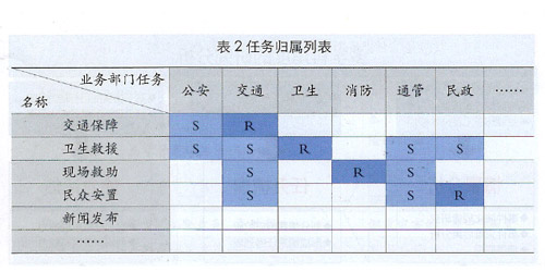 基于情景應對的任務清單逐步清晰以后,可以通過業務部門的座談分析,明確各項任務的歸屬,得出表2所示的任務歸屬列表(R表示負責、S表示支持)。實踐表明,該項工作將會有效查漏補缺,優化既有應急機制,彌補體制上的條塊分割與碎片化問題。