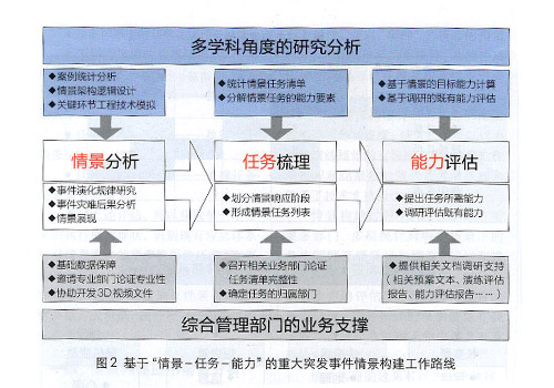 重大突發事件情景構建是理論與實踐的銜接,該項工作必須由科研部門和實踐綜合管理部門的密切配合,按照情景任務能力的邏輯主線依次展開,才能完成情景構建研究,具體工作路線如圖2所示。