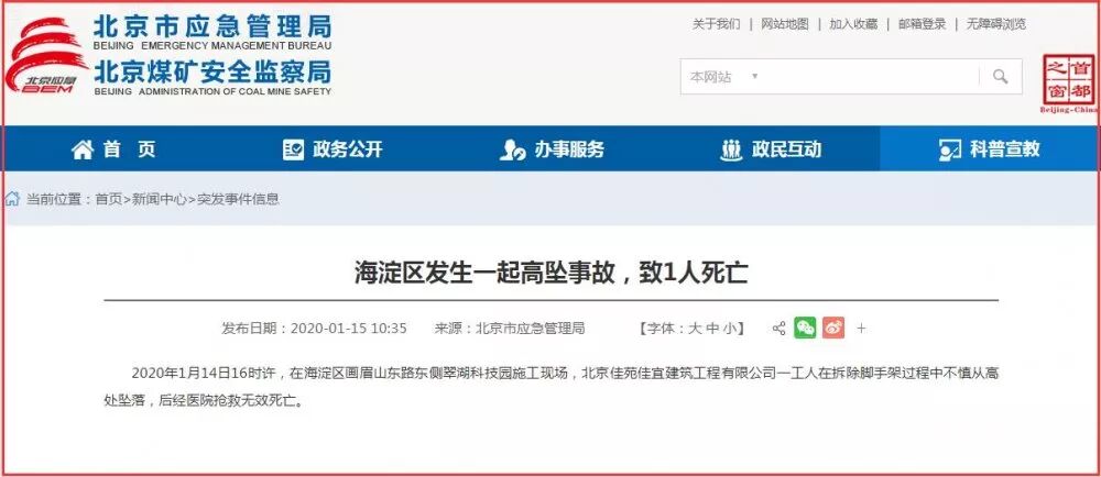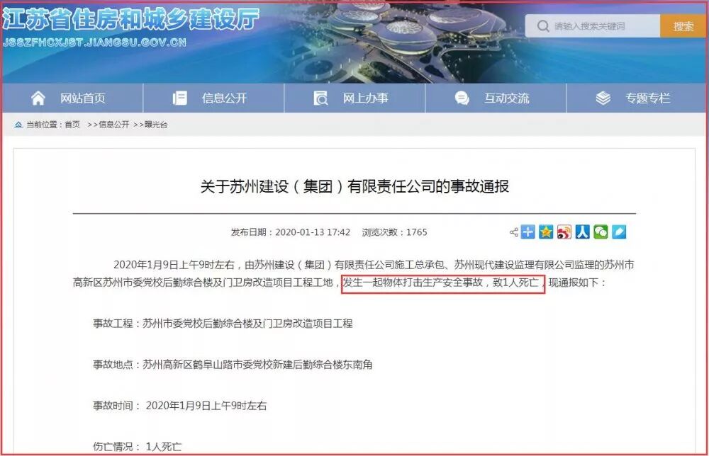 1月9日9時左右,江蘇省蘇州市高新區蘇州市委黨校后勤綜合樓及門衛房改造項目工程工地,在腳手架拆卸過程中有鋼管從4層(高度約11米左右)處掉落,鋼管擊中1名工地看護人員(男,47歲,安徽省桐城人)頭部,經搶救無效死亡。