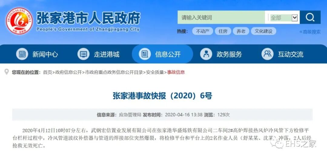 2020年4月12日10時(shí)07分左右,武鋼宏信置業(yè)發(fā)展有限公司在張家港華盛煉鐵有限公司二車(chē)間2#高爐焊接熱風(fēng)爐冷風(fēng)管下方檢修平臺(tái)欄桿過(guò)程中,冷風(fēng)管道波紋補(bǔ)償器與管道的焊接部位突然爆裂,將檢修平臺(tái)和平臺(tái)上的2名作業(yè)人員(舒某某、沈某)沖落,2人后經(jīng)搶救無(wú)效死亡。(來(lái)源:張家港市人民政府)