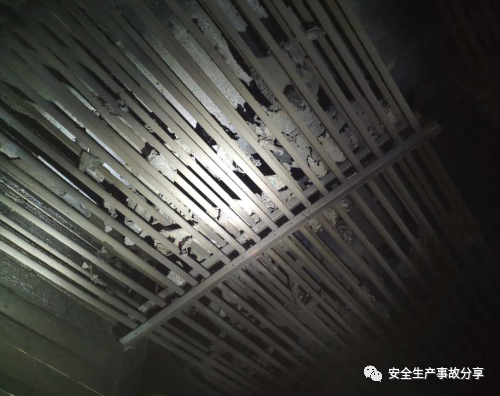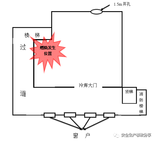 下午13時,操作人員趙任林、朱業海和婁文見3人在四樓冷庫(見圖2位置)作業。四樓頂部的制冷排管是用鋼筋固定的。鋼筋穿過頂部的聚氨酯泡沫層固定在天花板上。拆除制冷排管必須先割斷鋼筋。趙任林和婁文見用氧氣瓶、丙烷瓶的混合氣體形成的火焰槍對固定制冷設備管道的鋼筋進行熱切割作業。趙任林在熱切割鋼筋時引燃冷庫頂部的聚氨酯保溫材料,頂部開始起火。