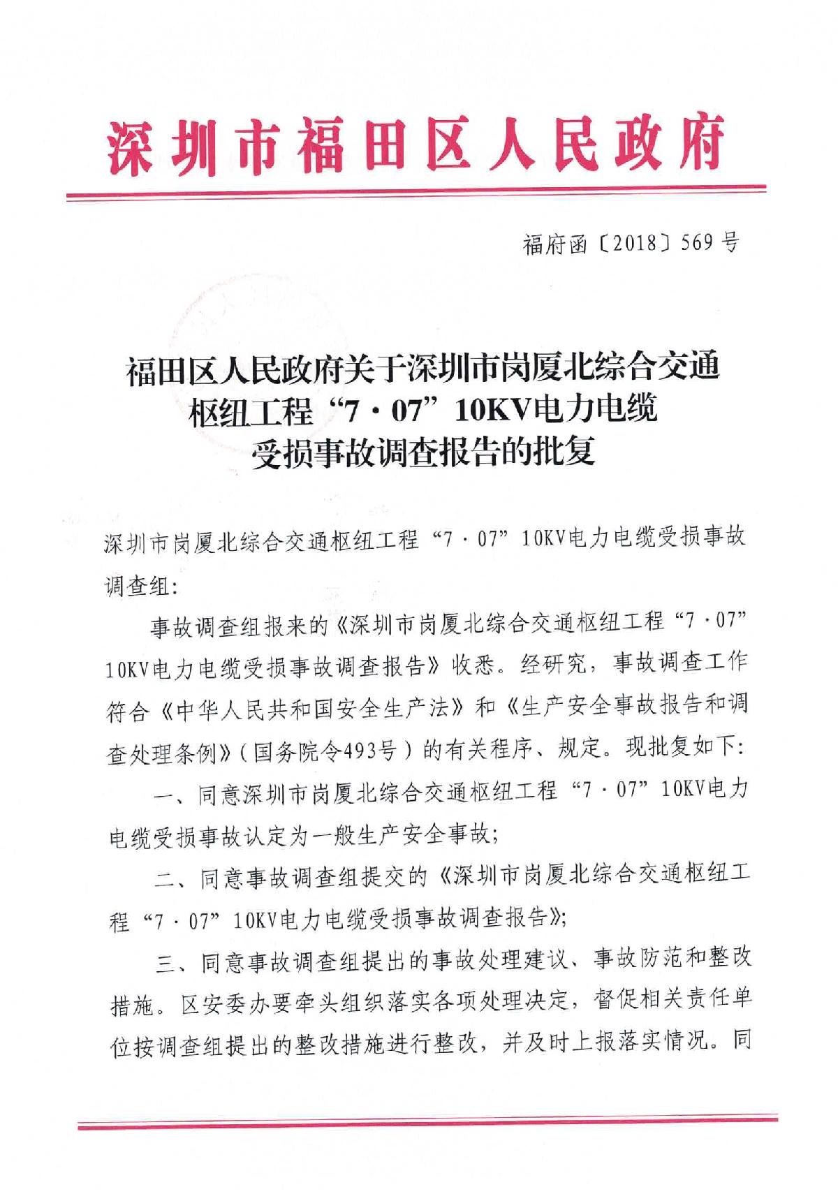 福田區人民政府關于深圳市城市軌道交通6號線二期主體工程6111標“7.05”10kv電力電纜受損事故調查報告