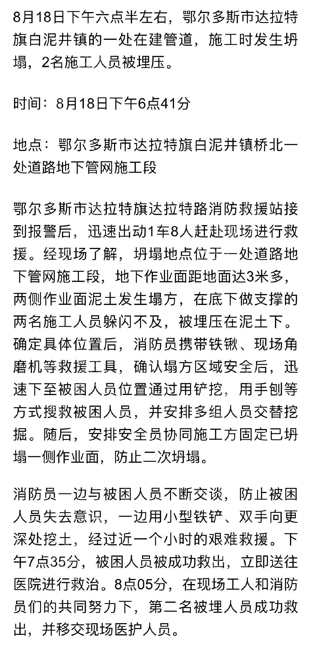 【事故信息】2人被埋,鄂爾多斯一在建管道施工時突然坍塌